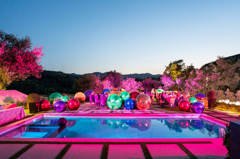 On top of the design, there were oversized spheres in all the colors that were installed throughout the entire celebration space. 6ft in dimension to as small as 3ft in diminution. It was an art installation of color that literally surrounded the dining and entertainment space.